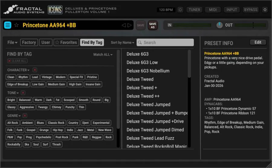 At a glance, the range is impressively comprehensive, featuring amps inspired by Princeton, VibroVerb, Bassman, Twin, Deluxe, Super, and many more. As with Fractal’s hardware, these are fully interactive analog-style models—not captures—complete with detailed tone-shaping controls.
